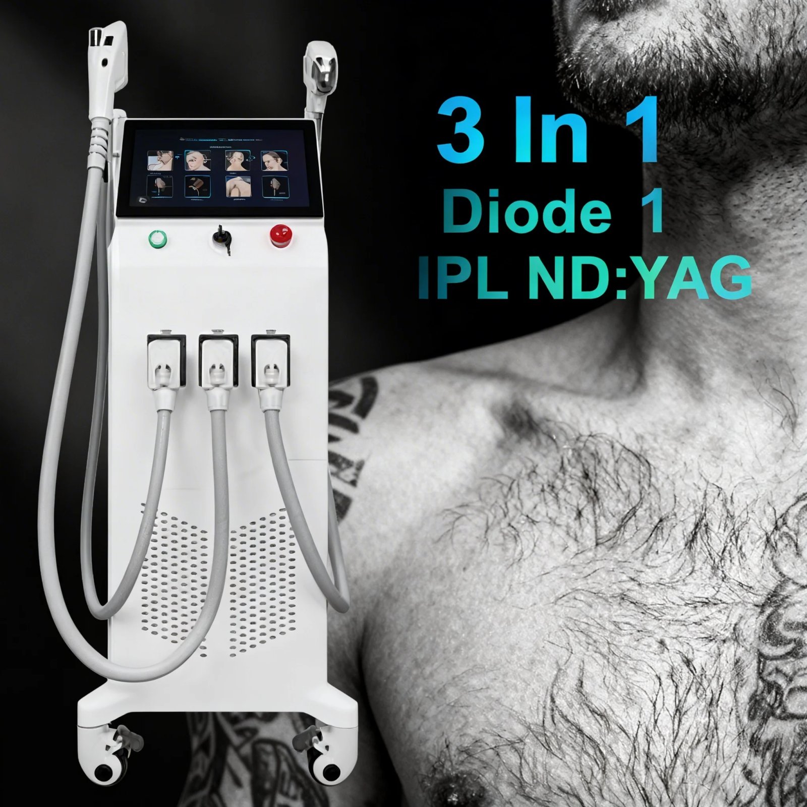 | Included Handpieces | 808nm Diode Laser Handle, E-Light/IPL Handle, Q-Switched ND:YAG Handle |
