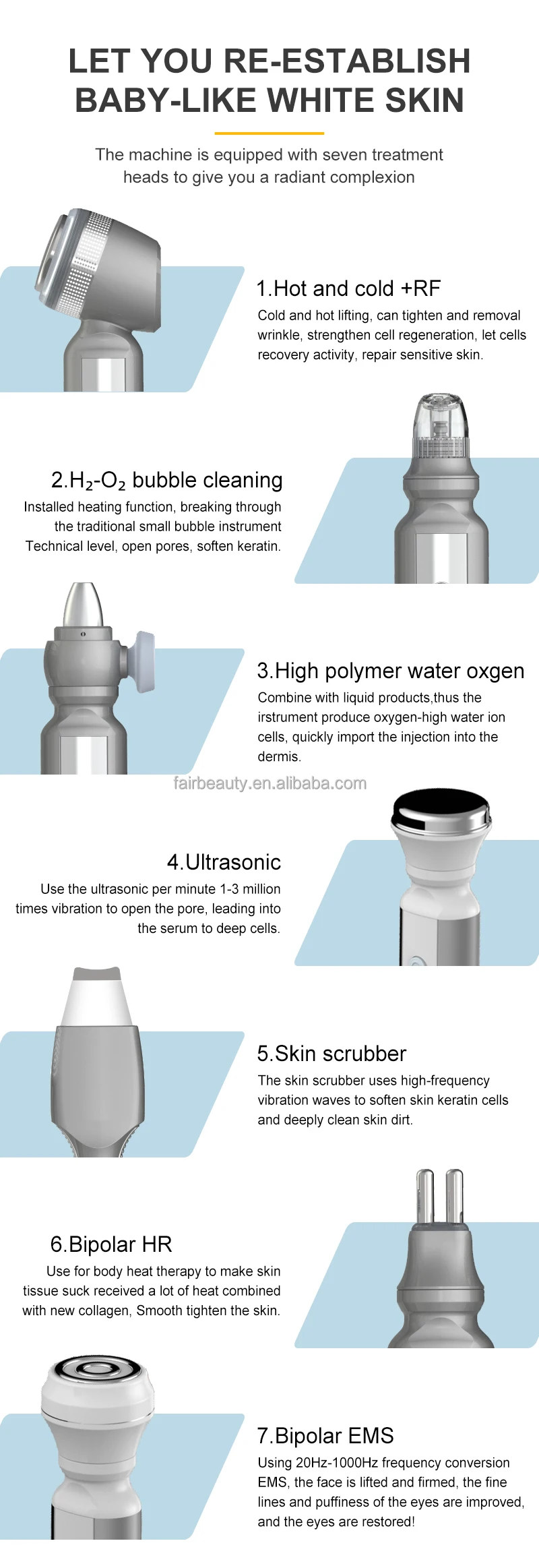 - 7. Dual-Mode Hot/Cold + RF: Combined thermal lifting and wrinkle reduction to stimulate cellular regeneration and repair the skin barrier.