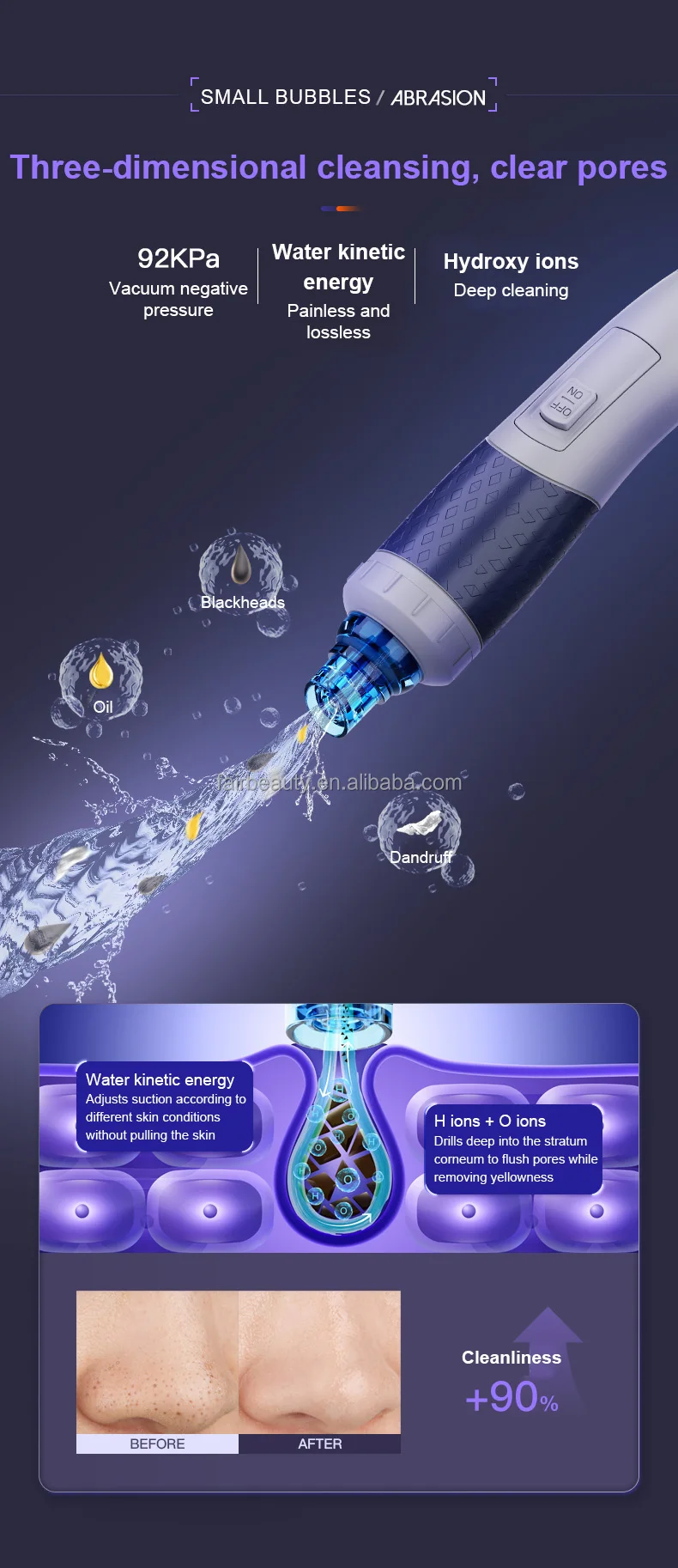 High-pressure (92KPA) vacuum suction combined with hydrogen-oxygen infusion. Flushes out blackheads, cosmetic residues, and excess sebum while hydrating the dermis.