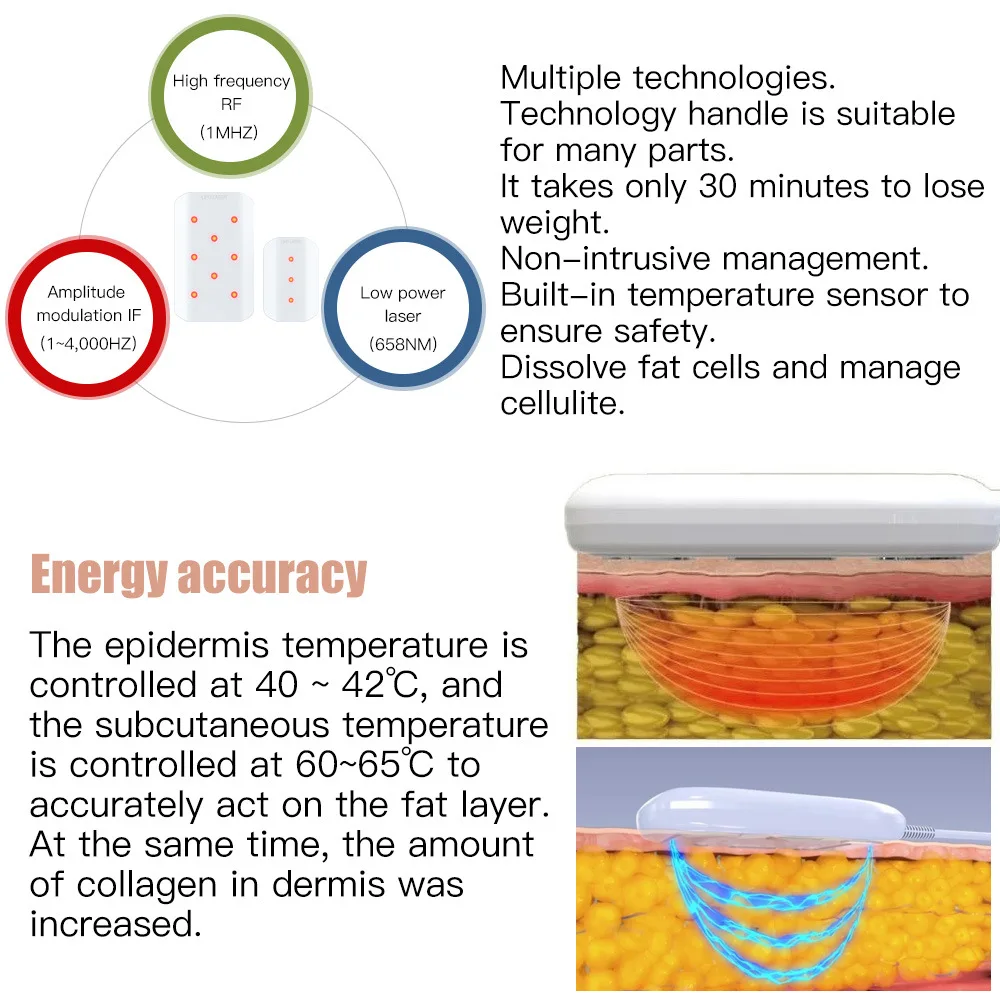 Safe And Comfortable Operation: Built-in temperature sensor controls epidermis temperature at 40-42°C and subcutaneous temperature at 60-65°C, avoiding skin damage while accurately acting on fat layers, and the non-intrusive design ensures a painless experience.